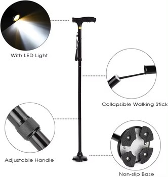 Bastón para caminar con luz LED, bastón de aluminio plegable, bastones ligeros y ajustables para equilibrio de personas mayores